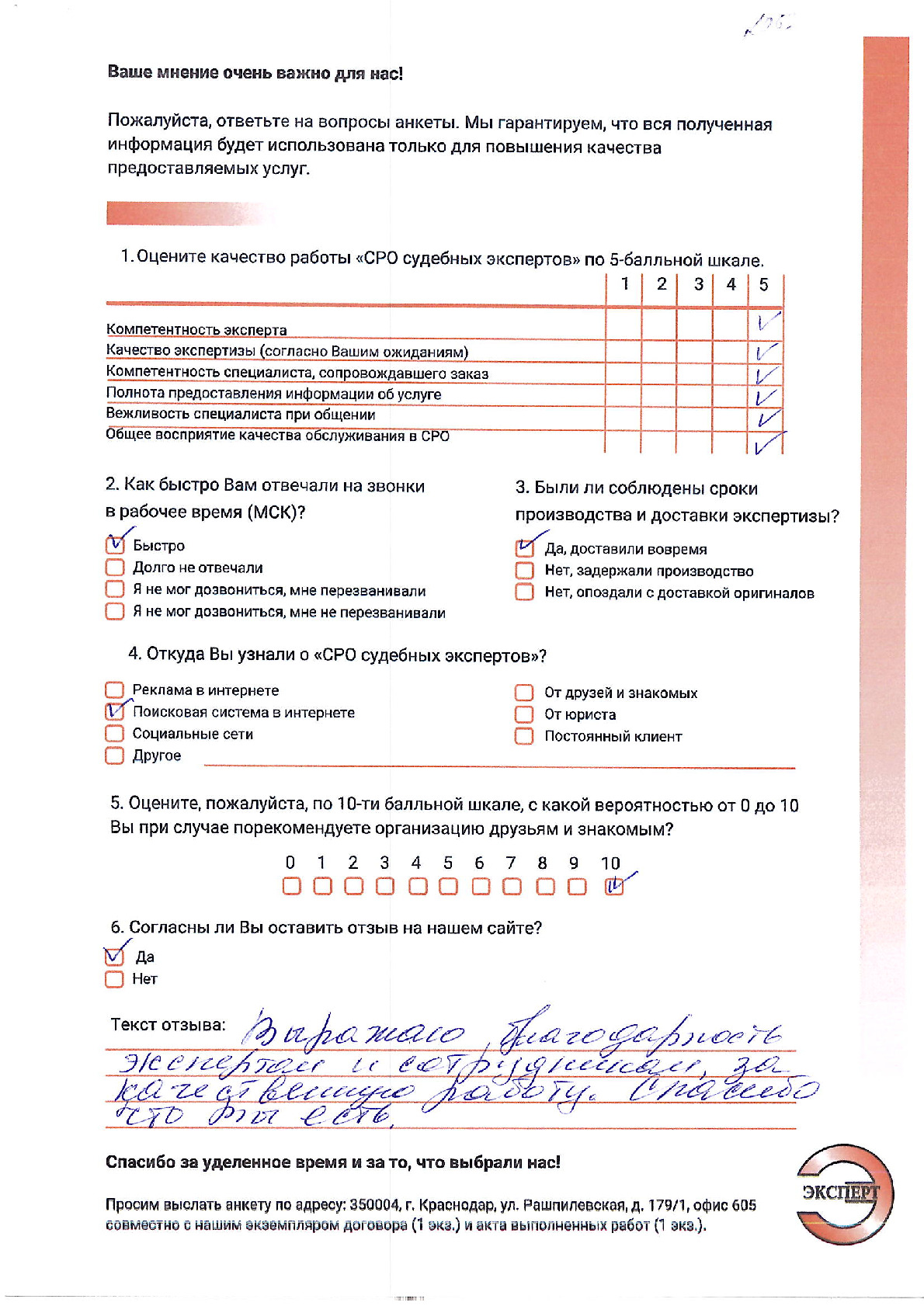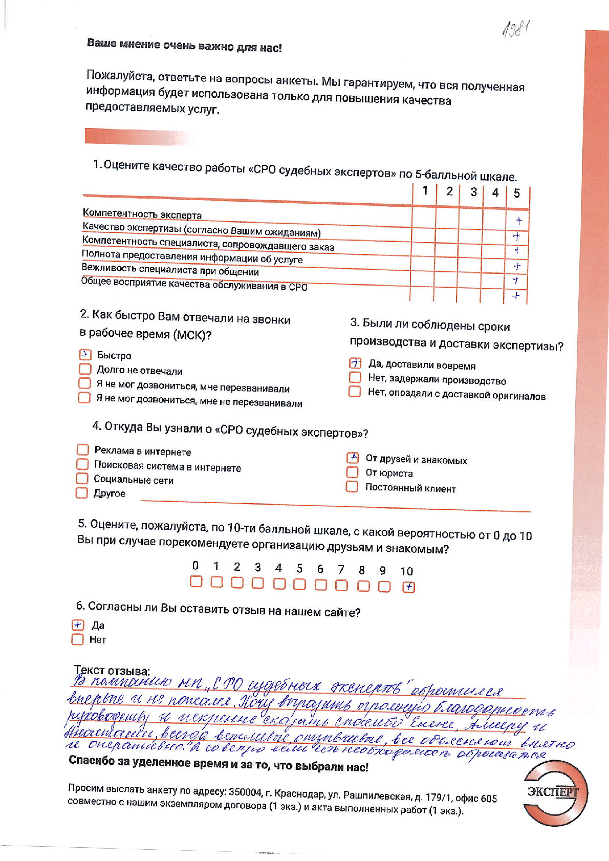 Выражаю благодарность компании НП «СРО Судебных экспертов». Специалисты грамотные, все сделано и доставлено вовремя. Услуги недорогие. Персонал внимательный. Рекомендую всем и при случившейся впредь необходимости обращусь только к ним. Спасибо Вам.