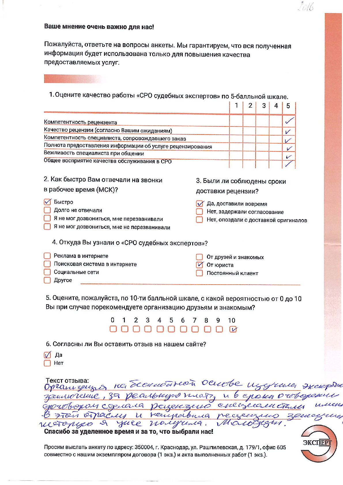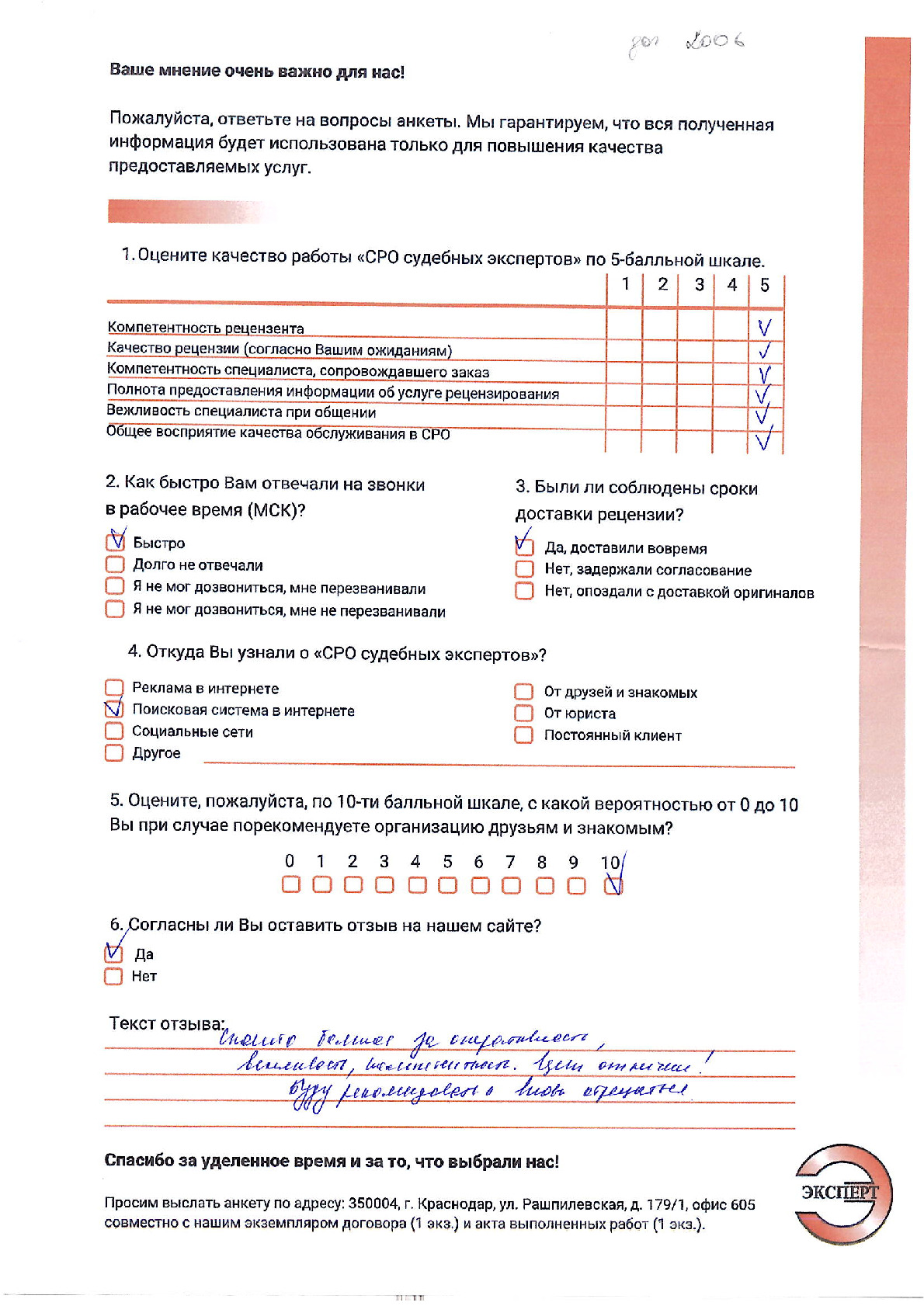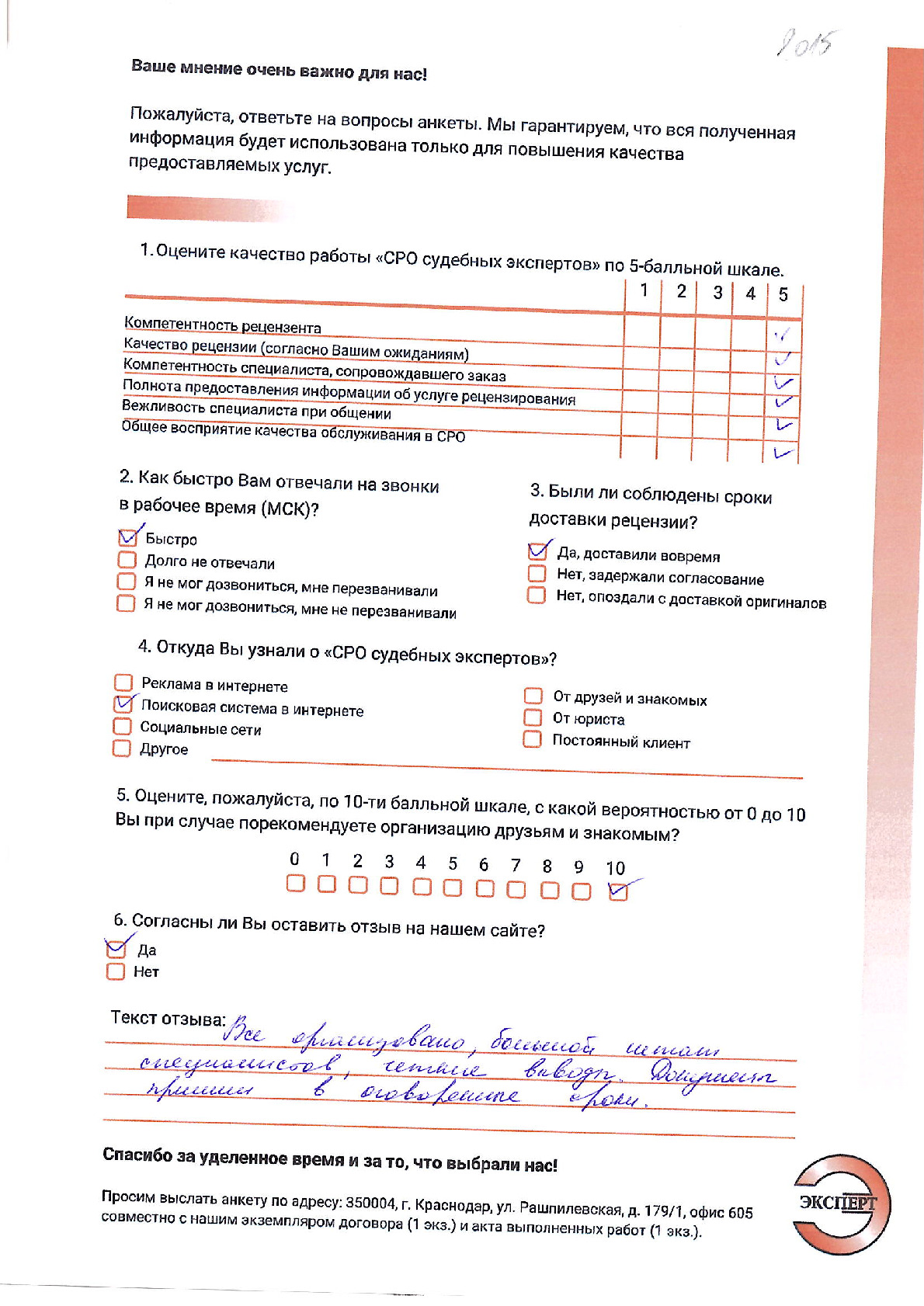 Выражаю благодарность НП «СРО судебных экспертов» и ООО «Экспрус» за слаженную и квалифицированную работу специалистов компании при подготовке рецензии на заключение эксперта, полное сопровождение и своевременное выполнение договорных обязательств, а также внимательное и доброжелательное отношение к своим клиентам. Благодаря профессиональной компетентности ведущего специалиста Луняка Н. уже при первичном обращении в организацию получена необходимая юридическая и подробная консультативная помощь, что послужило убедительной мотивацией для сотрудничества с НП «СРО судебных экспертов». Несмотря на дистанционный характер взаимодействия необходимо отметить мобильное и оперативное решение всех вопросов специалистом Луняка Н., а также индивидуальный подход при работе с клиентом. Особую благодарность выражаю высококвалифицированным специалистам Бочкаревой О. и Бергман В., которые при подготовке рецензии досконально и аргументировано проанализировали заключение эксперта, детально и объективно разобрались в нюансах объекта исследования и качественно выполнили работу по подготовке рецензии в кратчайшие сроки. Хотелось бы отметить работу специалиста отдела рецензирования Корсуновой В. по оказанию необходимой помощи в решении текущих вопросов и оперативном информировании о ходе подготовки рецензии на экспертное заключение и сопроводительных документов. С уверенностью могу рекомендовать НП «СРО судебных экспертов» и ООО «Экспрус» всем, кто желает получить качественные услуги в области рецензирования экспертного заключения.