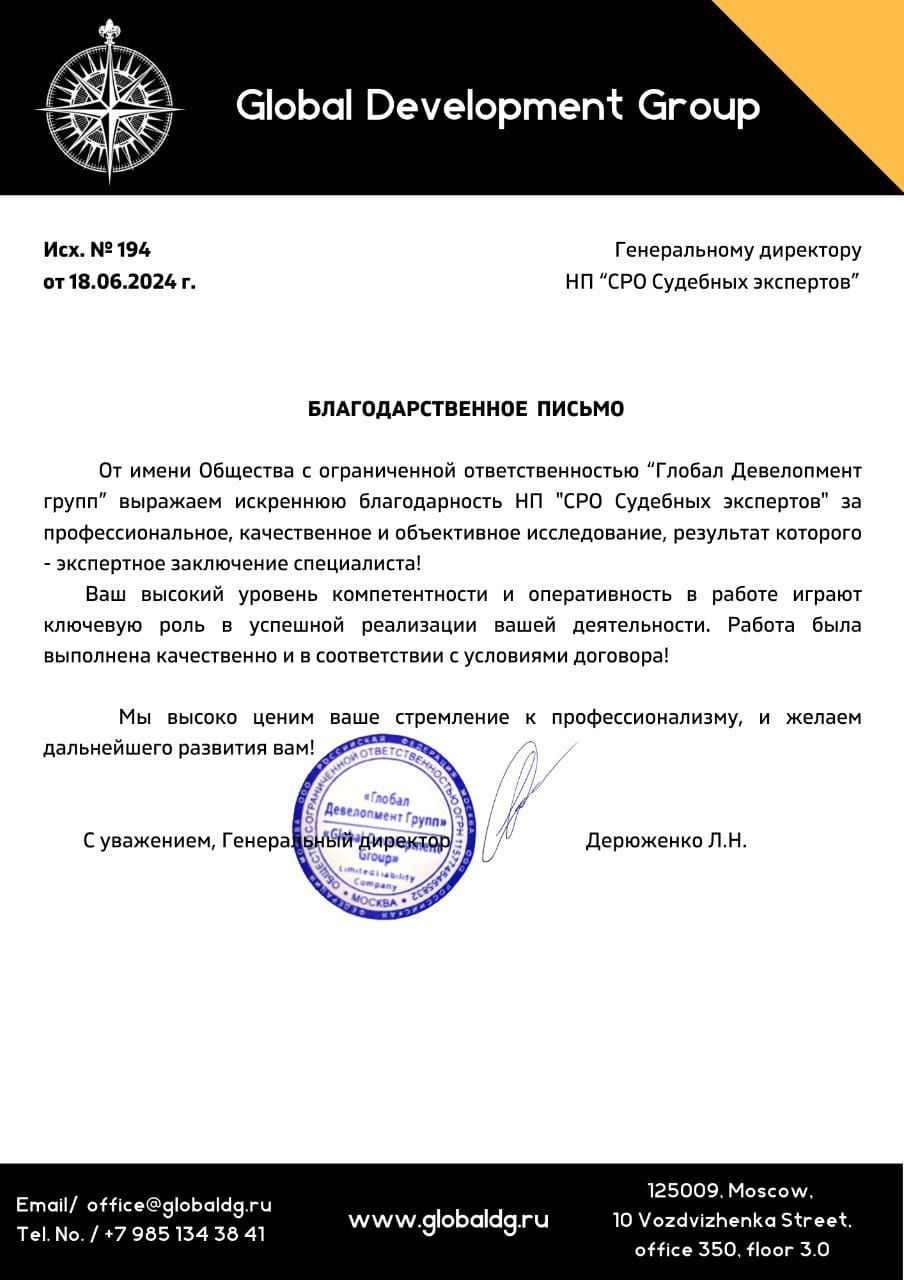 От имени ООО «Глобал Девелопмент» выражаем искреннюю благодарность НП «СРО судебных экспертов» за профессиональное, объективное исследование, результат которого — экспертное заключение специалиста!Ваш высокий уровень компетентности и оперативность в работе играют ключевую роль в успешной реализации Вашей деятельности. Работа была выполнена качественно и в соответствии с условиями договора.Мы высоко ценим Ваше стремление к профессионализму и желаем дальнейшего развития!