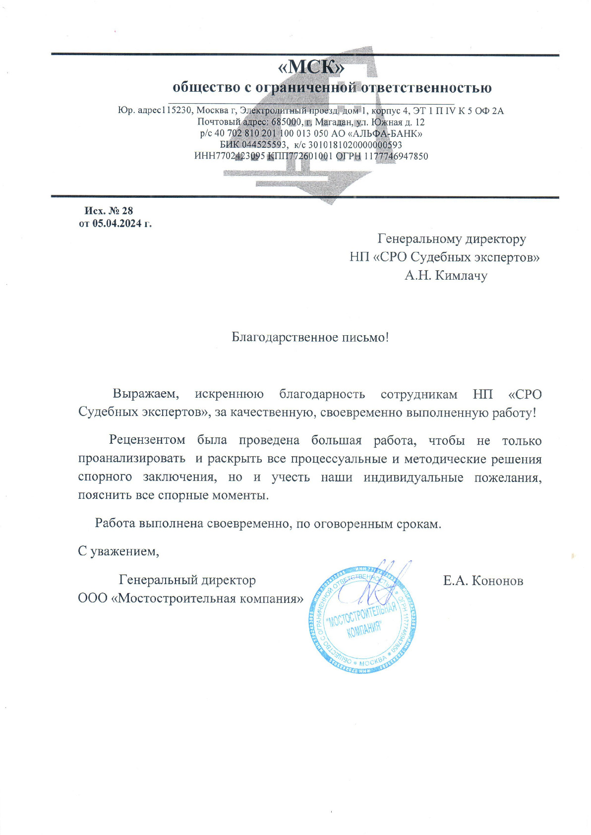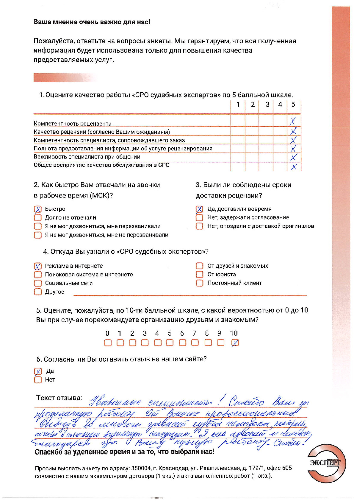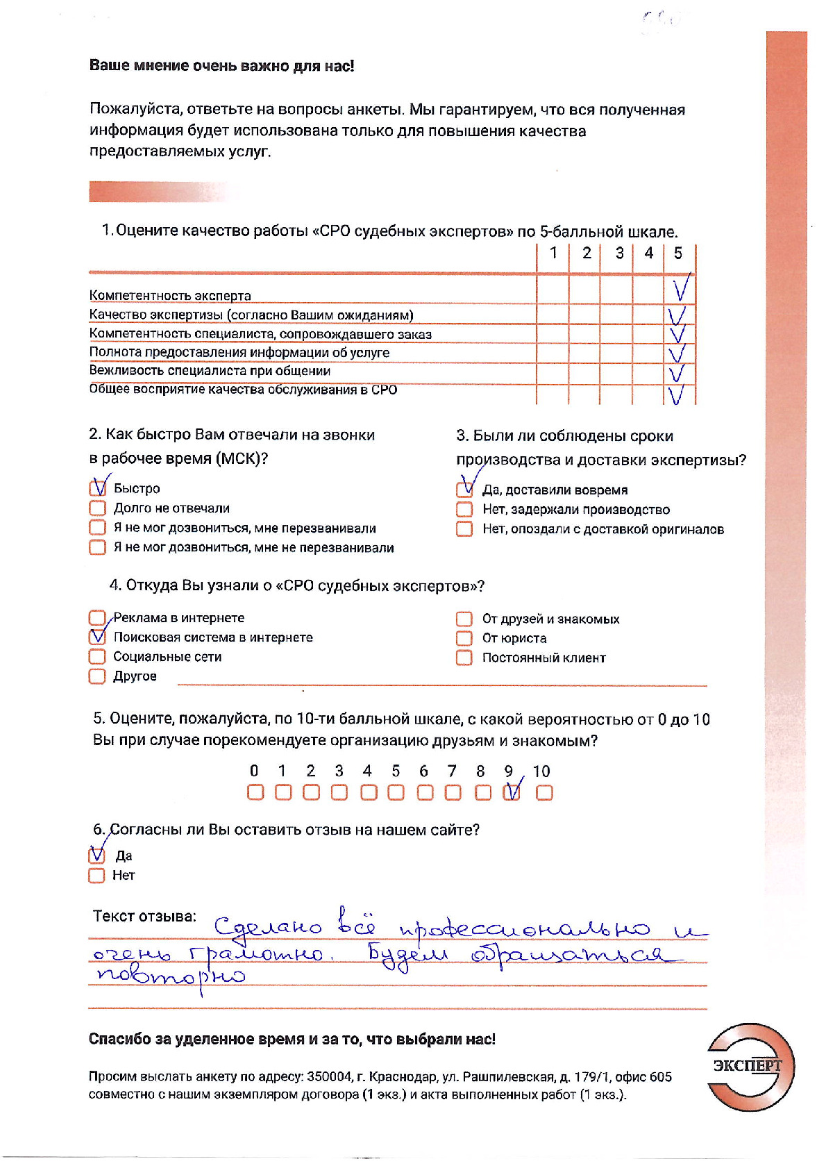 Выражаем благодарность НП «СРО судебных экспертов» за профессионализм и качество оказанных услуг, высокую обязательность и точное соблюдение сроков по договорным отношениям. Полностью удовлетворены выбором Вашей компании. Компетентность Ваших сотрудников и оперативность в выполнении поставленных перед ними задач позволили нам в кратчайшие сроки получить грамотное Заключение. Желаем Вашей компании успехов, процветания и надеемся на дальнейшее сотрудничество.
