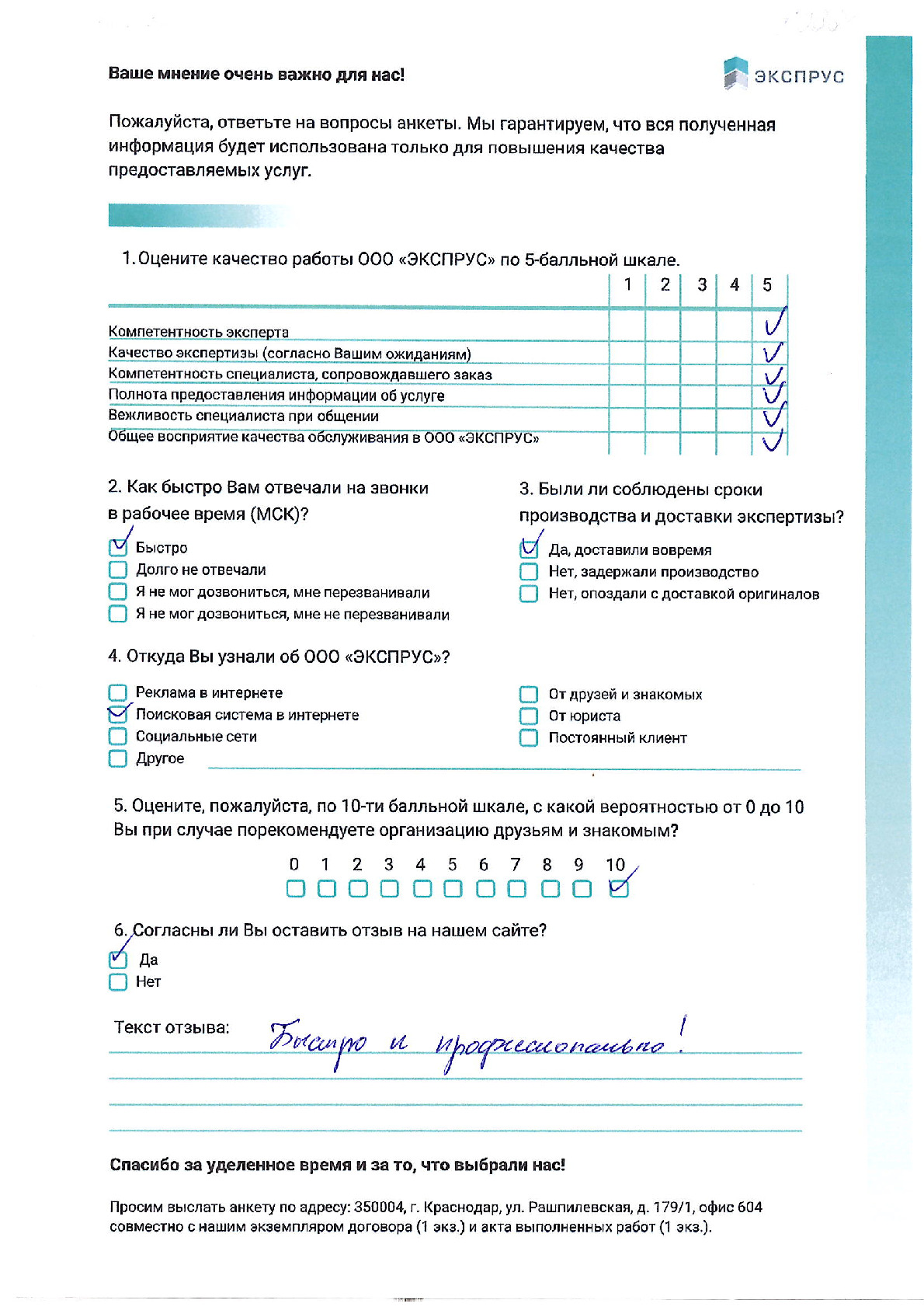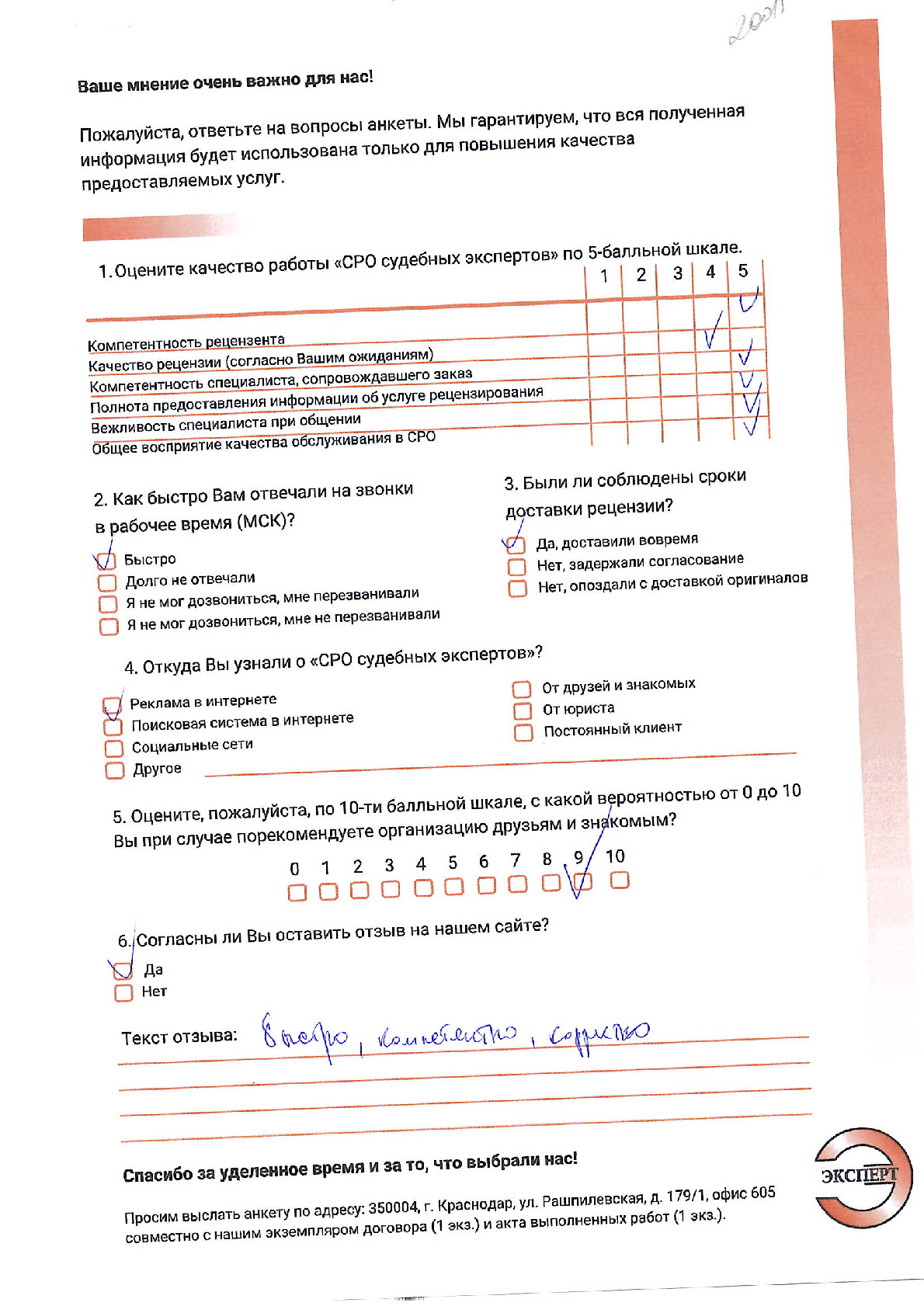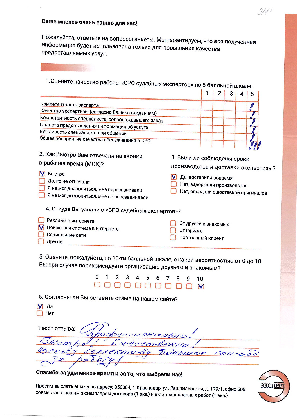 Выражаем благодарность НП «СРО судебных экспертов» за профессионализм и качество оказанных услуг, высокую обязательность и точное соблюдение сроков по договорным отношениям. Полностью удовлетворены выбором Вашей компании. Компетентность Ваших сотрудников и оперативность в выполнении поставленных перед ними задач позволили нам в кратчайшие сроки получить грамотное Заключение. Желаем Вашей компании успехов, процветания и надеемся на дальнейшее сотрудничество.