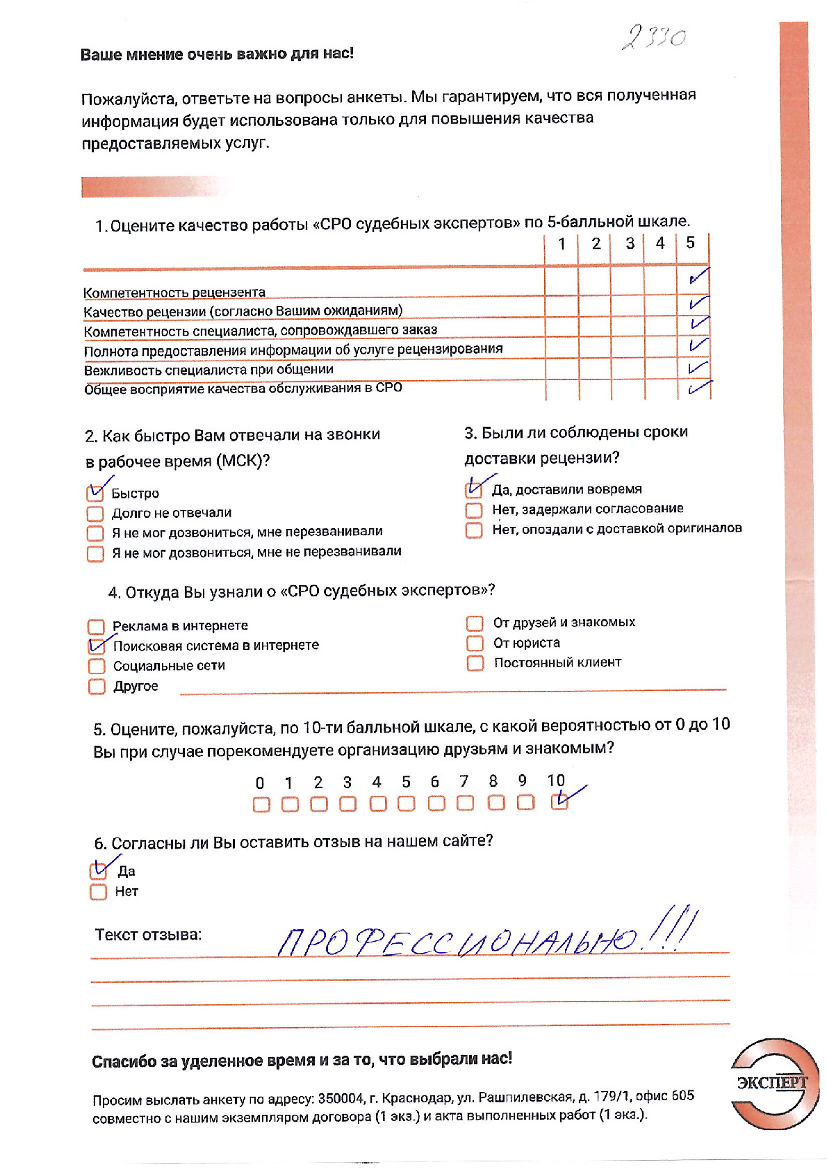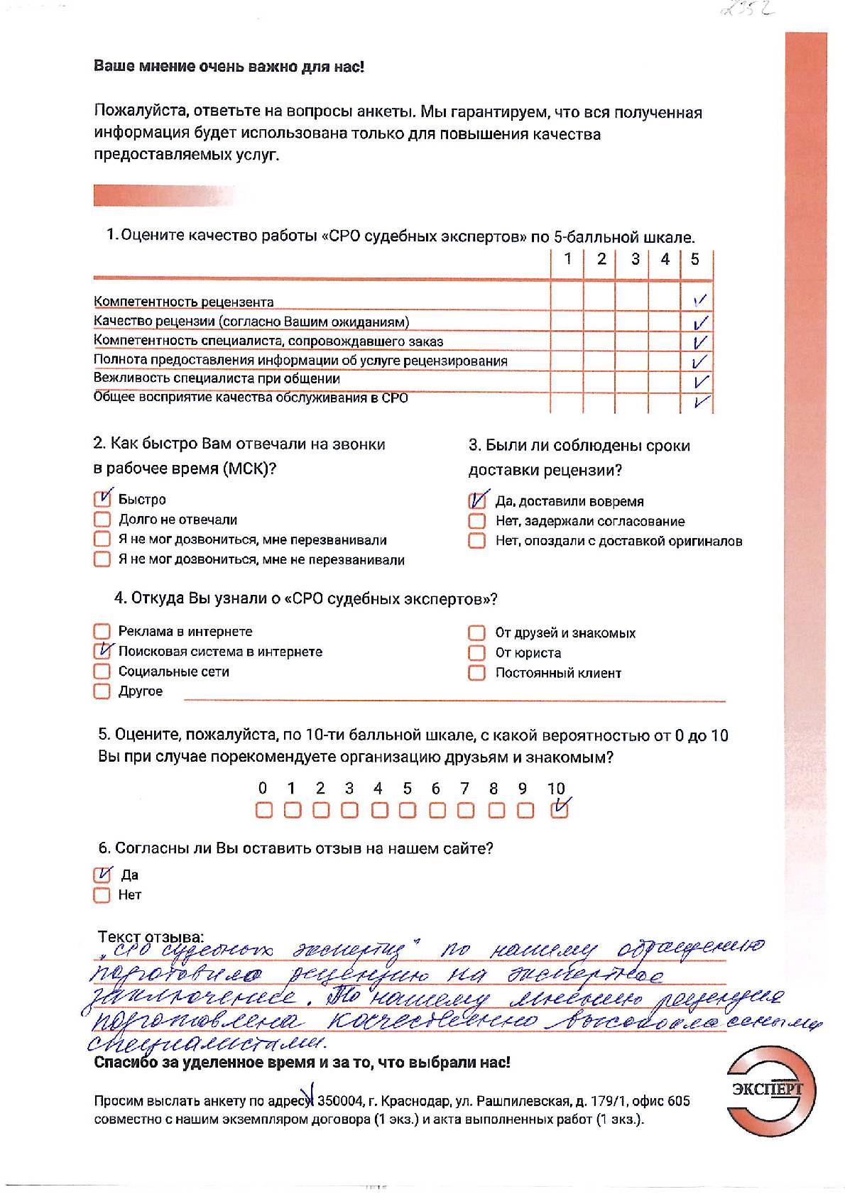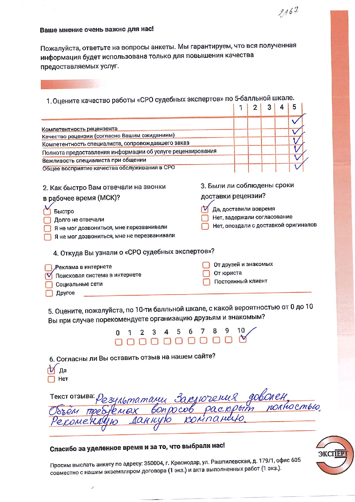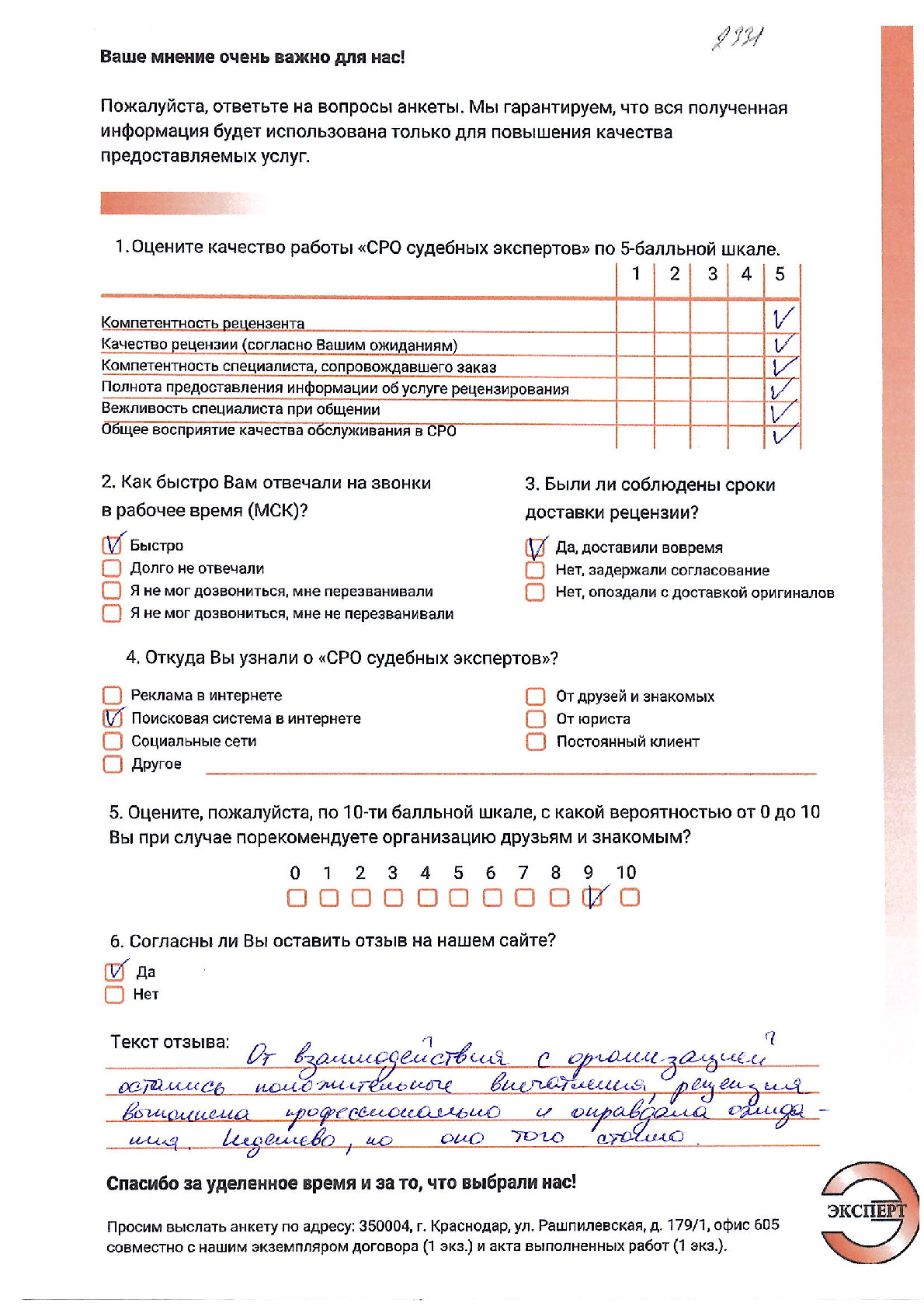 ООО «НИКО» в лице директора Алтухова К.А. выражает благодарность НП «СРО судебных экспертов» за проведенное рецензирование экспертизы. Хочется отметить ответственный подход к решению поставленной задачи сотрудников. Рецензия № 2053 была выполнена качественно и в обозначенный договором срок.