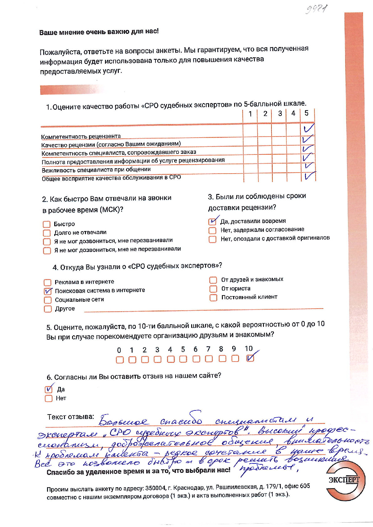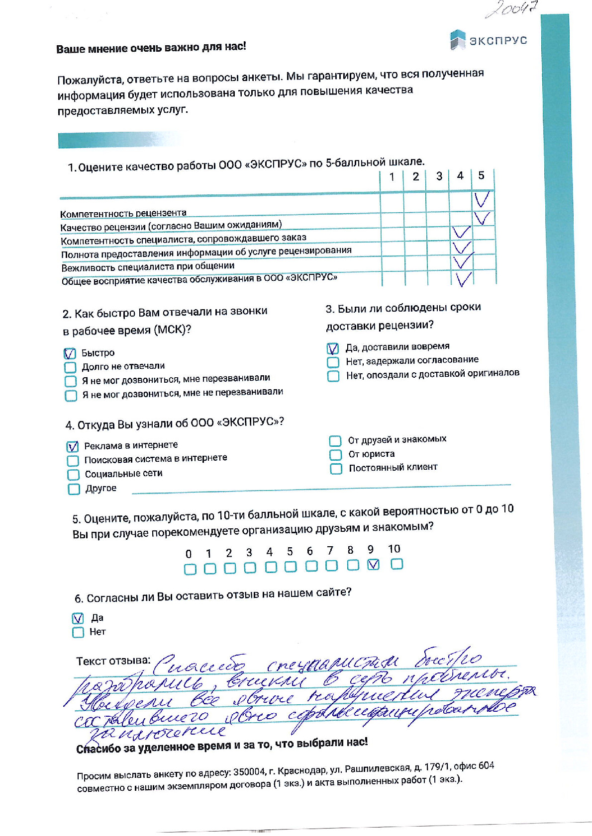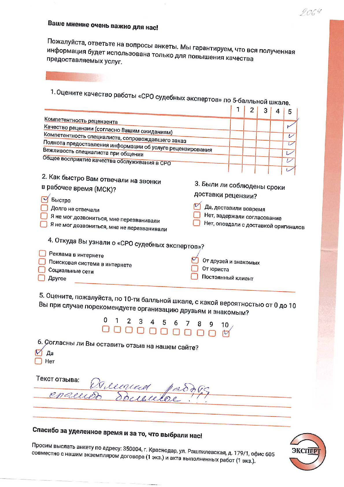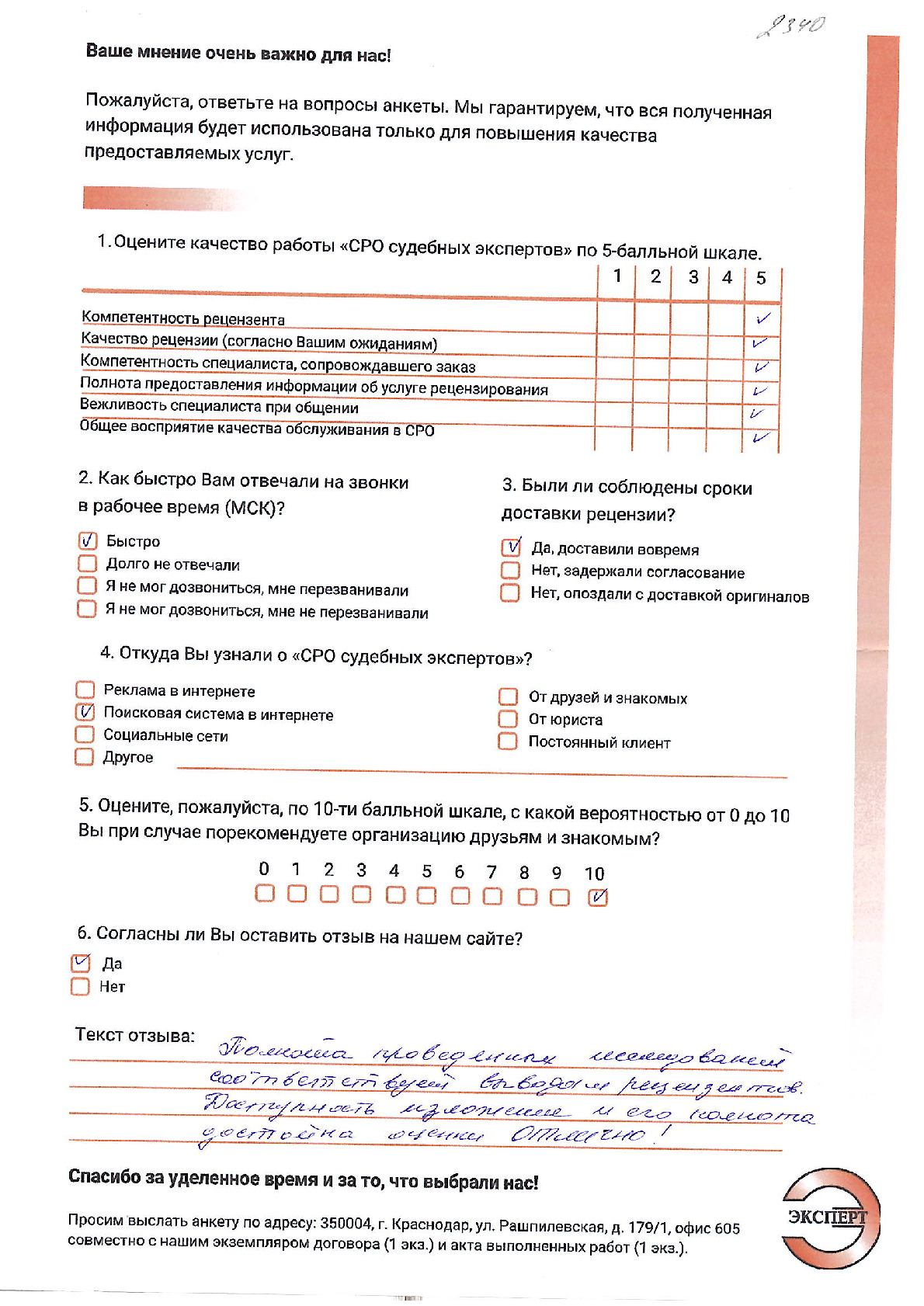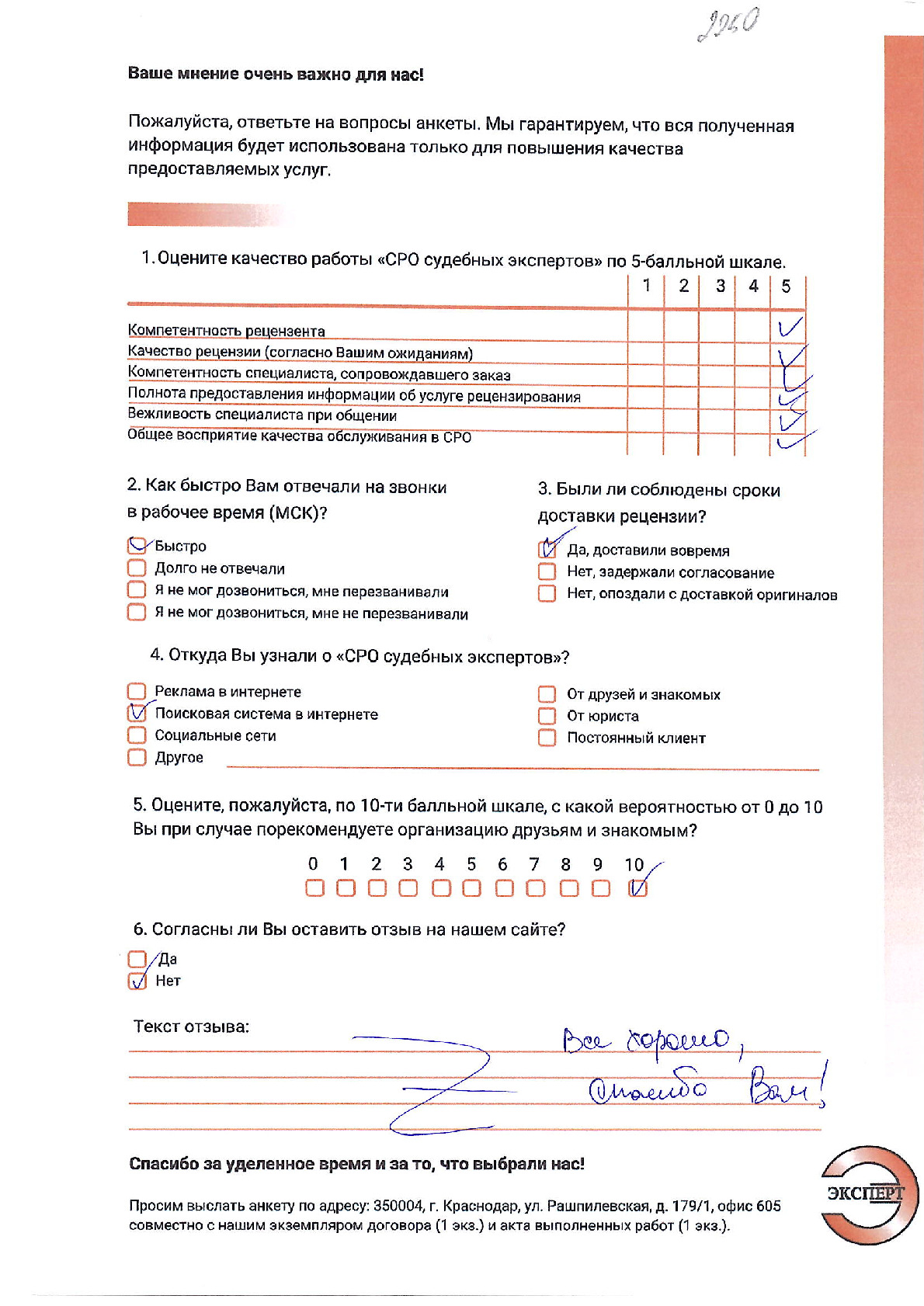 ООО «НИКО» в лице директора Алтухова К.А. выражает благодарность НП «СРО судебных экспертов» за проведенное рецензирование экспертизы. Хочется отметить ответственный подход к решению поставленной задачи сотрудников. Рецензия № 2053 была выполнена качественно и в обозначенный договором срок.