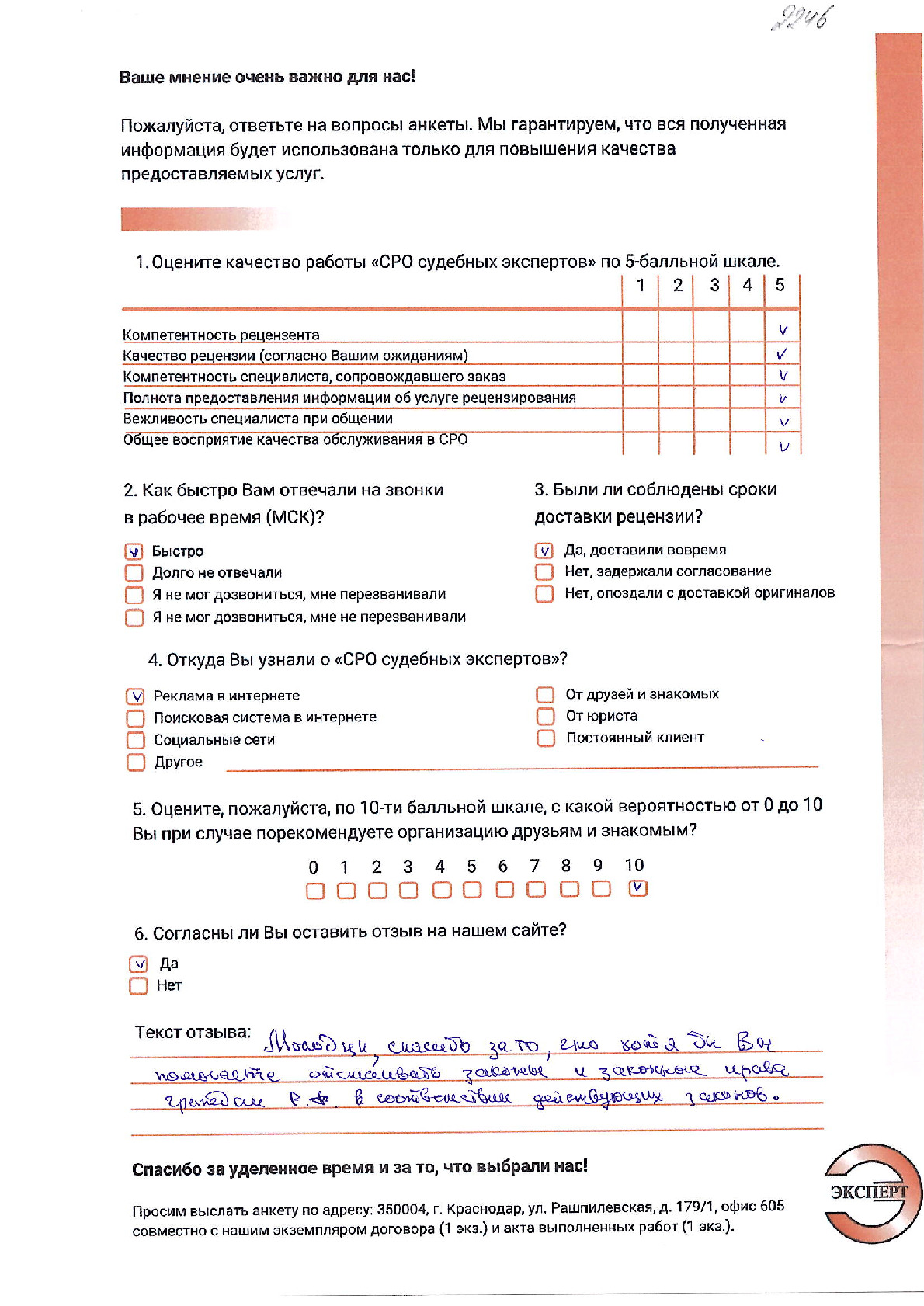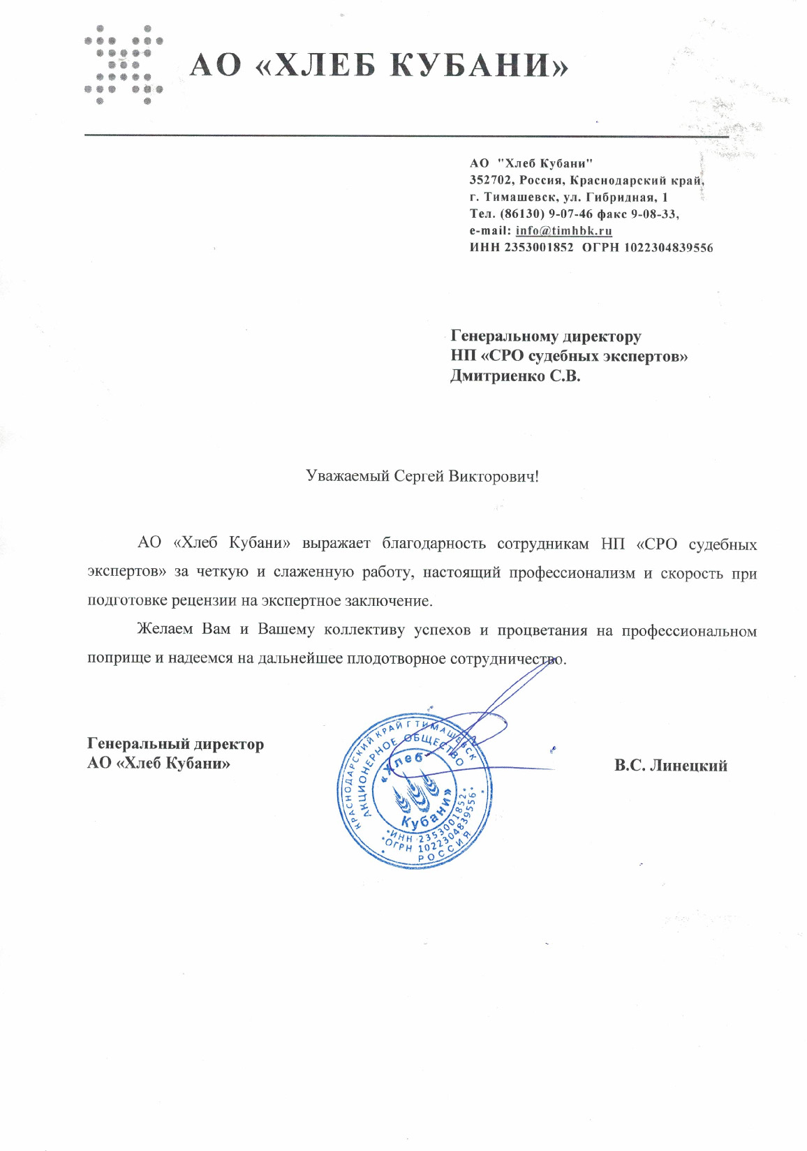 Уважаемый Сергей Викторович!АО «Хлеб Кубани» выражает благодарность сотрудникам НП «СРО судебных экспертов» за четкую и слаженную работу, настоящий профессионализм и скорость при подготовке рецензии на экспертное заключение. Желаем Вам и Вашему коллективу успехов и процветания на профессиональном поприще и надеемся на дальнейшее плодотворное сотрудничество.