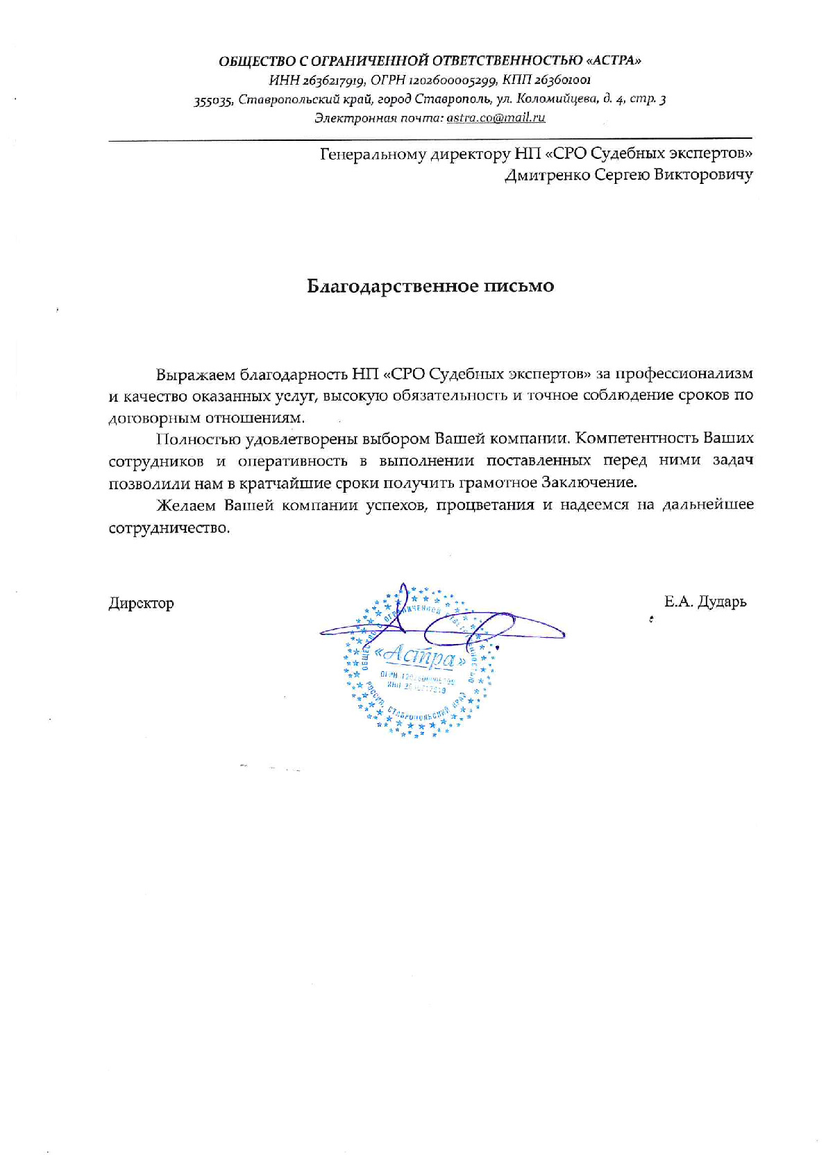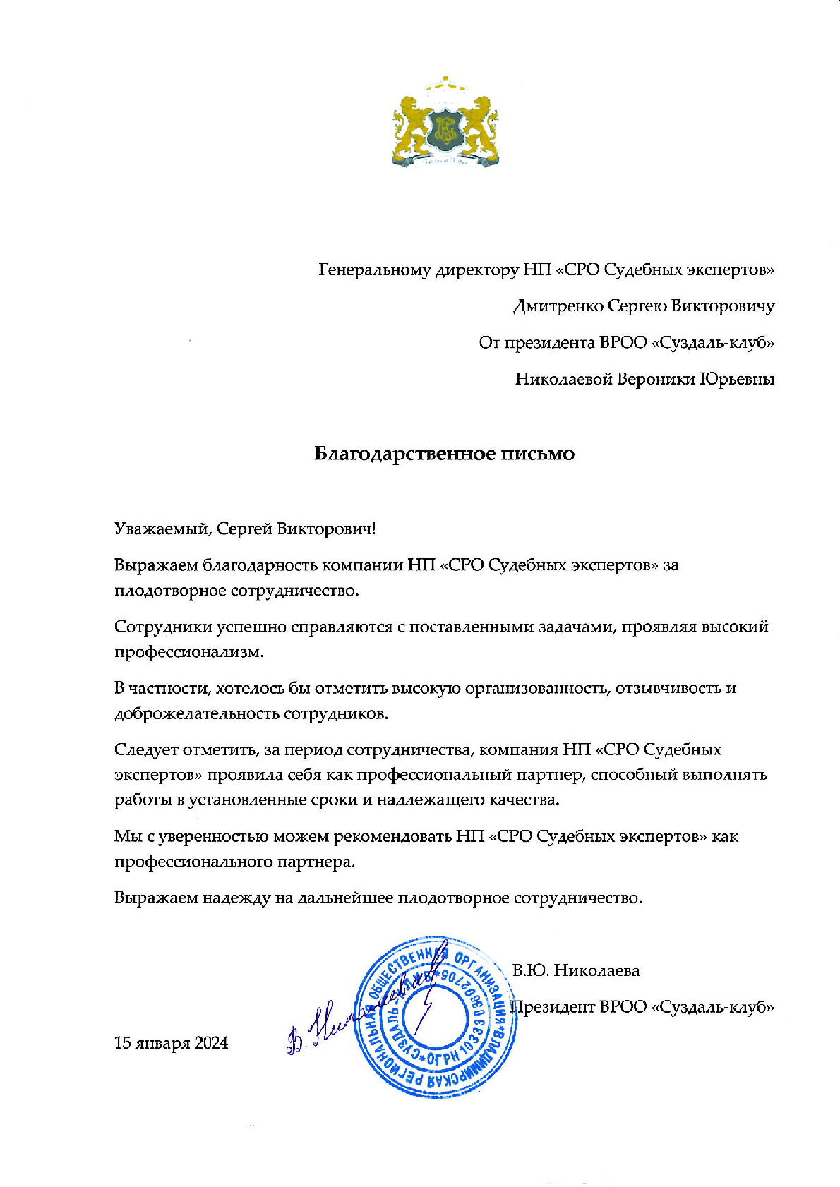 Выражаем благодарность компании НП «СРО судебных экспертов» за плодотворное сотрудничество. Сотрудники успешно справляются с поставленными задачами, проявляя высокий профессионализм. В частности, хотелось бы отметить высокую организованность, отзывчивость и доброжелательность сотрудников. Следует отметить, за период сотрудничества компания НП «СРО судебных экспертов» проявила себя как профессиональный партнер, способный выполнять работы в установленные сроки и надлежащего качества. Мы с уверенностью можем рекомендовать НП «СРО судебных экспертов» как профессионального партнера. Выражаем надежду на дальнейшее плодотворное сотрудничество.