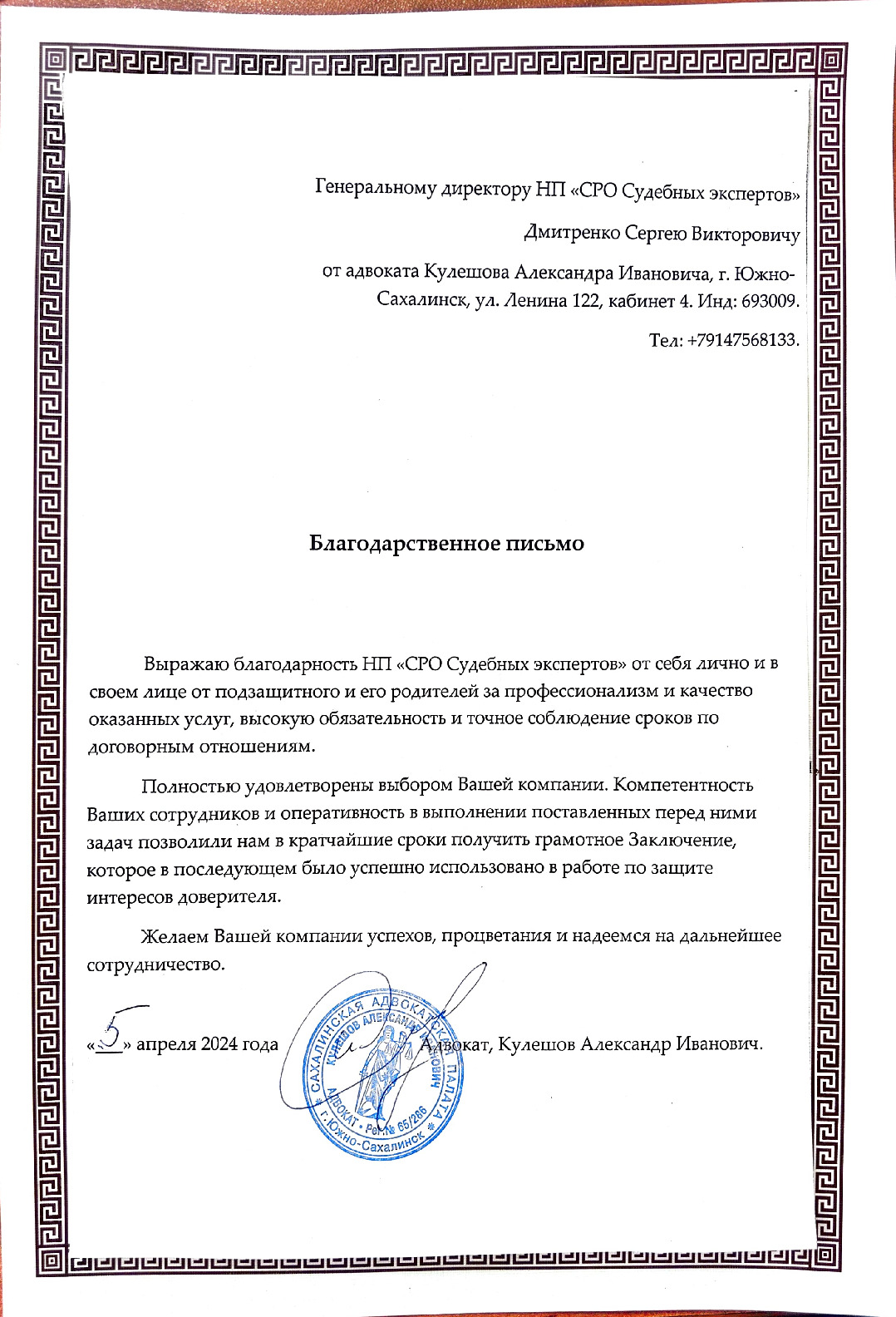 Выражаю благодарность НП «СРО судебных экспертов» от себя лично и в своем лице от подзащитного и его родителей за профессионализм и качество оказанных услуг, высокую обязательность и точное соблюдение сроков по договорным отношениям. Полностью удовлетворены выбором Вашей компании. Компетентность Ваших сотрудников и оперативность в выполнении поставленных задач позволили нам в кратчайшие сроки получить грамотное Заключение, которое в последующем было успешно использовано в работе по защите интересов доверителя. Желаем Вашей компании успехов, процветания и надеемся на дальнейшее сотрудничество.